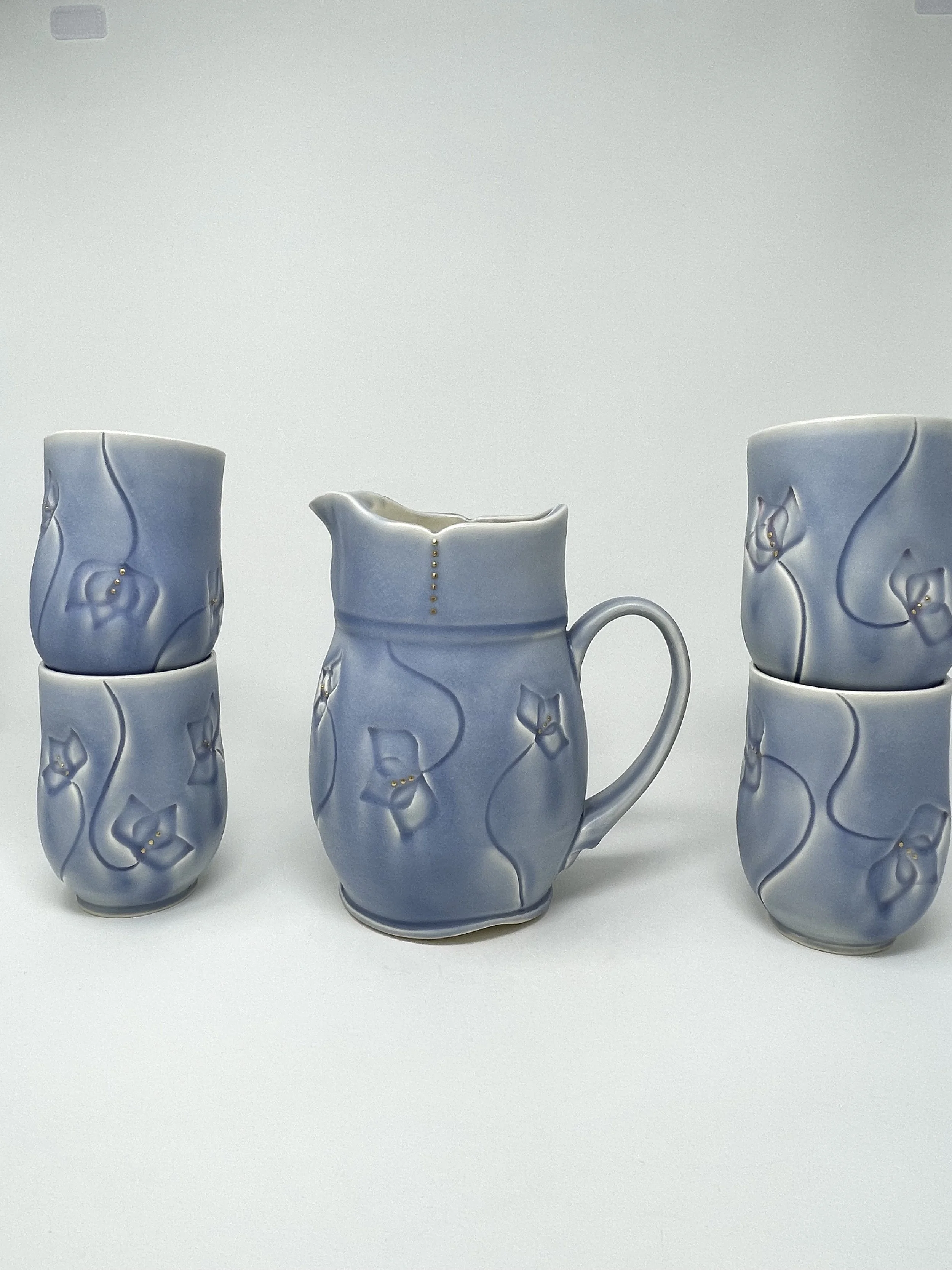 Wheel thrown pitcher and 4 tumblers with hand carved and stamped floral motif. Soft Periwinkle matte glaze is a dream to touch and rest the eyes on. Would make a great lemonade pitcher, or margarita pitcher for summer sipping.